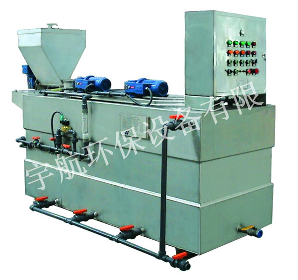 本設備可滿足固體和液體絮凝劑的自動制備,主要由:三腔藥箱,自動吸料機、自動投粉機、自動配水系統、出藥系統,就地電氣控制系統等組成。